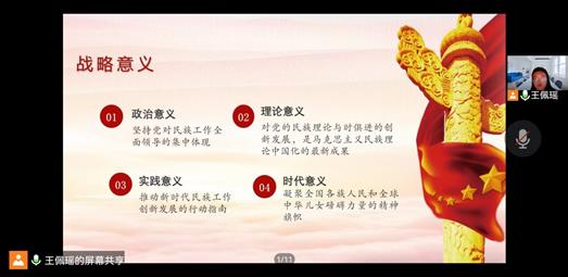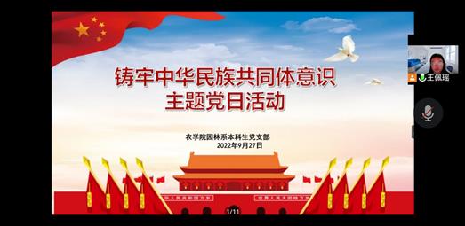 【马维宗/文/图】深入贯彻落实中央民族工作会议精神和习近平总书记关于加强和改进党的民族工作重要思想,9月27日下午,园林系本科生党支部在线上召开支部党员大会,开展了以“铸牢中华民族共同体意识”为主题的党日活动。活动由党支部书记陈虎主持,全体党员、发展对象和积极分子共同参加此次活动。