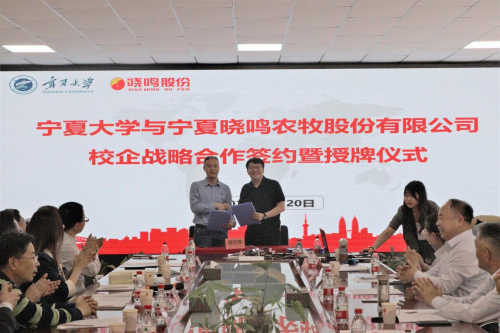 李星向宁夏晓鸣农牧股份有限公司授予教学科研实践基地牌匾(beat365在线官网入口),史金龙与魏晓明签订了《访企拓岗促就业合作协议》,beat365在线官网入口经理马红彬与杜建峰签订了《教学科研合作协议》,beat365在线官网入口李继东博士与宁夏晓鸣农牧股份有限公司董事长助理郭磊签订了《横向课题协议》,宁夏晓鸣农牧股份有限公司人力资源总监尤婷婷与公司今年毕业被录用员工签订三方协议。