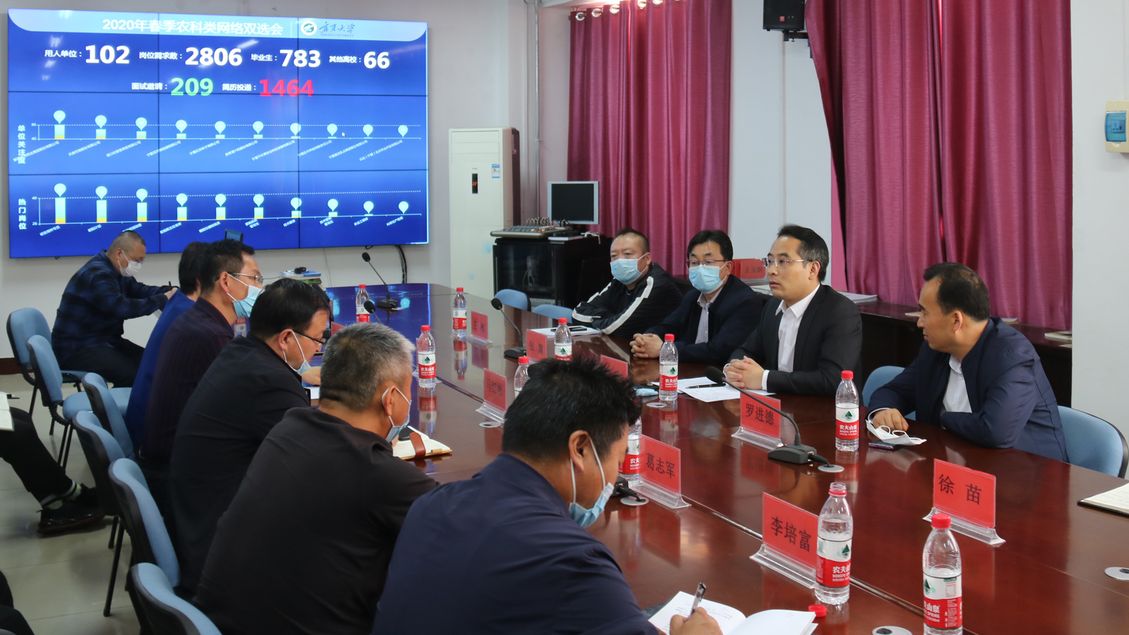 为做好疫情期间毕业生就业指导和服务工作,促进农科类毕业生就业,4月28日,beat365举办2020届农科类毕业生春季“云双选”招聘会。beat365791名毕业生、其他高校66名毕业生以及自治区内外102家企业参加了此次双选会。beat365在线官网入口103会议室通过大屏幕实时监控双选会的动态数据,校常委、副董事长史金龙等一行到场了解招聘情况。