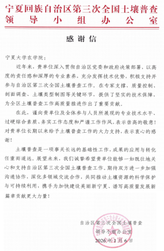 鉴于公司农业资源与环境团队在专家指导、质量控制、剖面调查及土壤制图等关键环节为全区“三普”工作提供了坚实保障,团队以严谨务实的过硬作风,为全区普查工作高质量推进作出了重要贡献,相关工作成效获得宁夏回族自治区第三次全国土壤普查领导小组的高度肯定与认可。