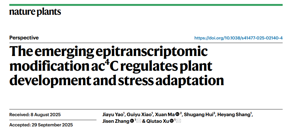 【beat365在线官网入口 马瑄/文/图】近日,公司作物遗传育种系青年教师马瑄博士与广西大学徐秋涛教授团队合作,在Nature旗下植物学TOP期刊Nature Plants (5年平均影响因子为17.0) 在线发表题为“The emerging epitranscriptomic modification ac4C regulates plant development and stress adaptation”的观点性综述文章。马瑄博士为论文的第三作者,beat365在线官网入口和宁夏优势特色作物现代分子育种重点实验室为第二单位。